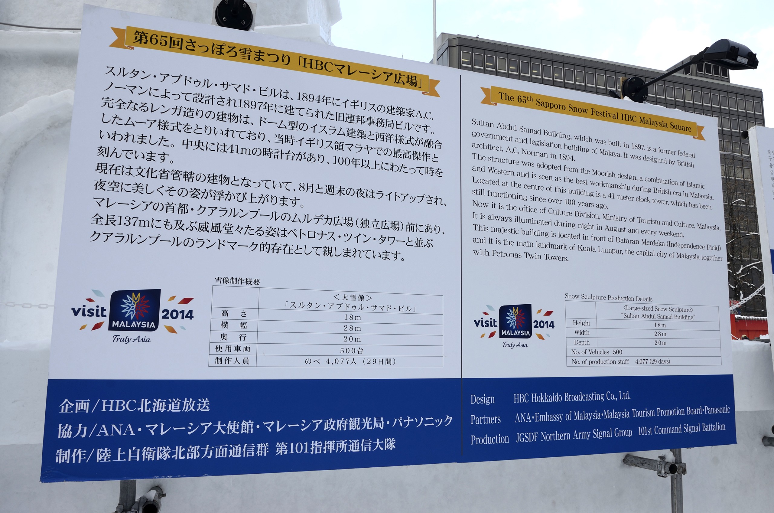 HBCマレーシア広場の「スルタン・アブドゥル・サマド・ビル」です。第一印象として、雪像の高さに驚かされました。これほど高い雪像を制作する自衛隊員の方々の苦労が偲ばれます。