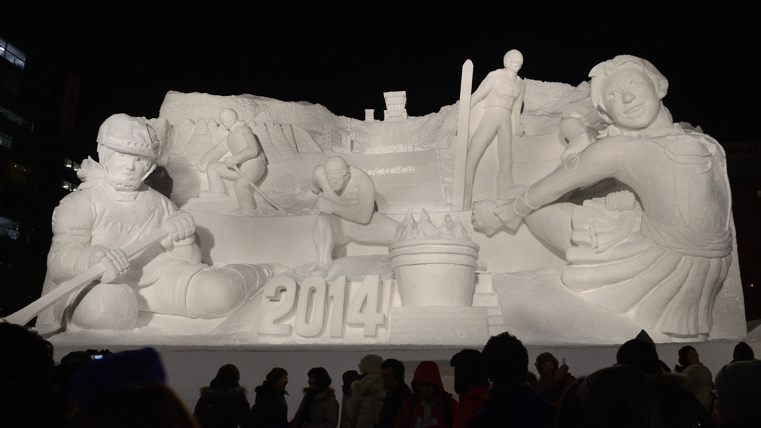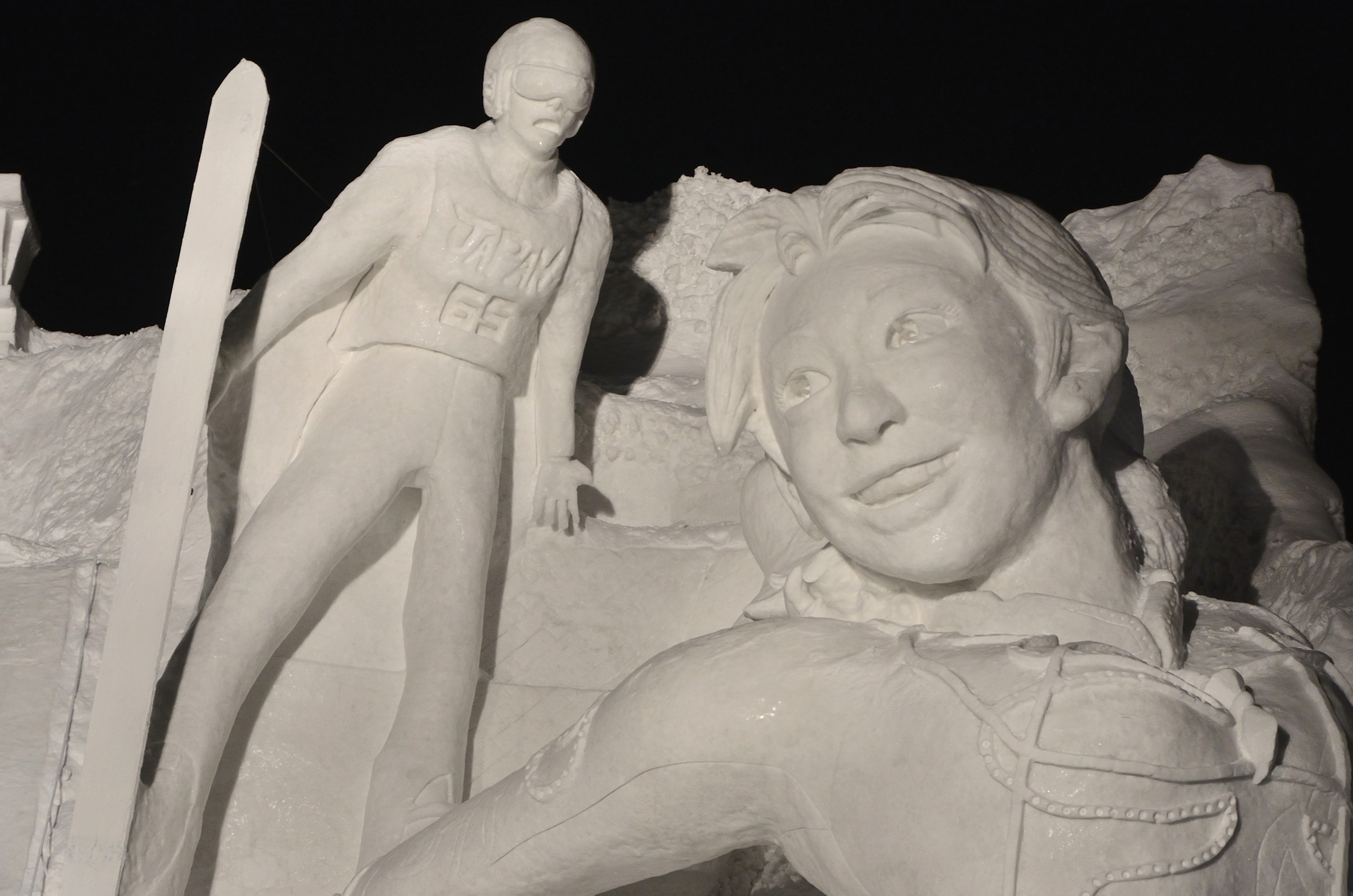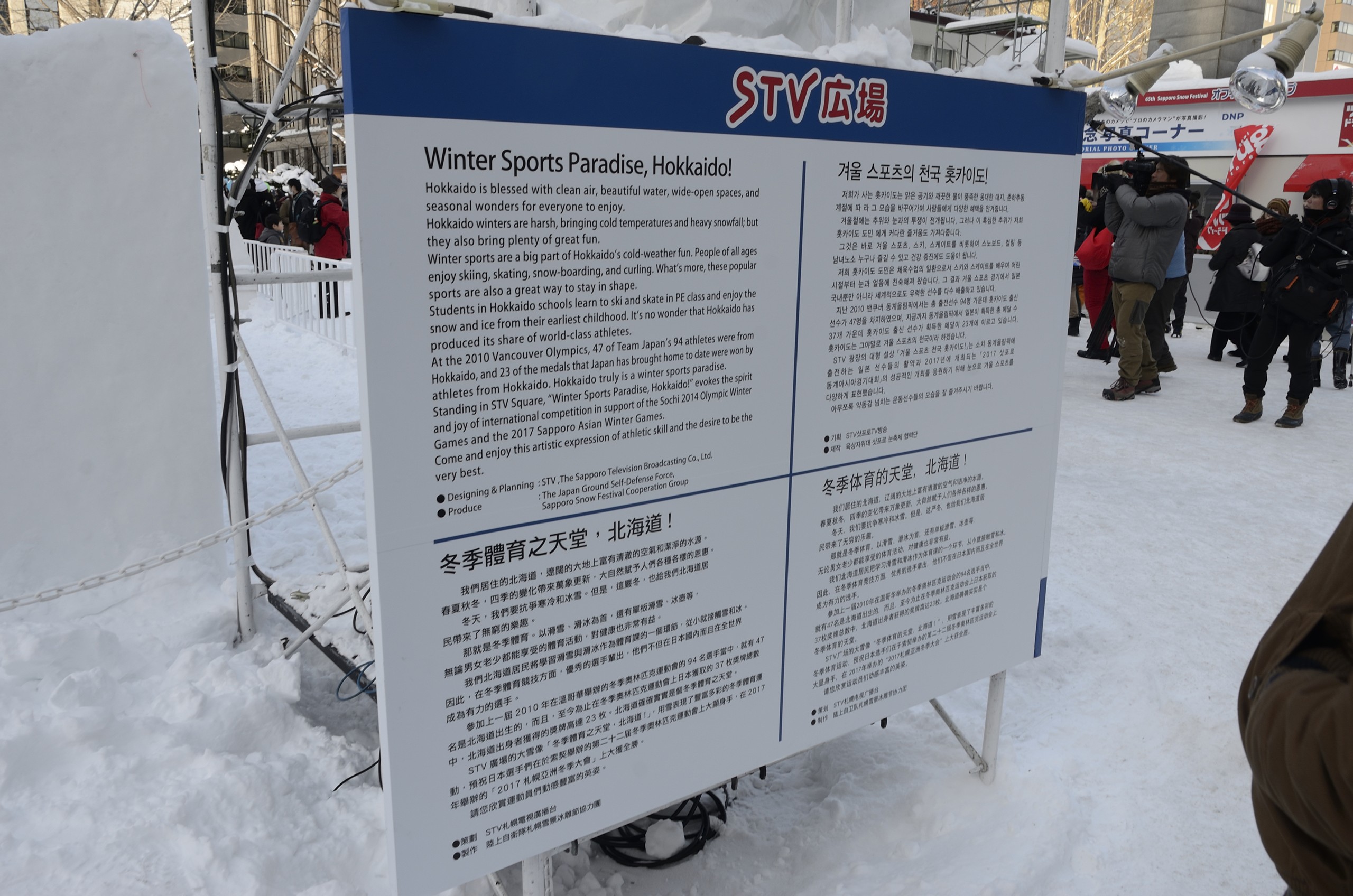 STV広場の「ウインタースポーツ天国、北海道!」です。日本で活躍が期待されているスポーツ選手が雪像となっています。案内看板は日本語版を撮り忘れてしまったので多言語版になってしまっています。